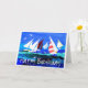 Une carte d'anniversaire avec un collage en papier peint à la main de bateaux à voile; voir aussi des cadeaux et des vêtements assortis.