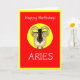 Une carte d'anniversaire pour quelqu'un né sous Bélier avec un bélier, d'une aquarelle de Judy Adamson. L'arrière - plan est rouge et jaune, pour un panneau de feu et l'accueil, en lettres blanches, est "Joyeux anniversaire ! ARIES'.