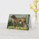 Chien Vizsla tenant son truc carte de voeux photo. Le texte à l'avant dit "Joyeux anniversaire !" et le texte à l'intérieur dit "J'espère que vous passerez une bonne journée !"