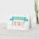 Carte d'anniversaire pour enseignant avec confetti coloré, texte rétro de style lettré à la main et bannière vintage en bleu clair, orange, jaune, vert et rose chaud.