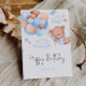 Célébrez un anniversaire spécial avec cette carte adorable et fantaisiste qui présente un mignon ours en peluche flottant parmi des nuages moelleux et tenant un bouquet de ballons pastel dans les tons bleu, pêche et beige. Le design gai s'accompagne de détails ludiques comme des étoiles et un petit oiseau charmant. Parfait pour les enfants ou les amateurs de design doux et charmant, cette carte est personnalisée avec le nom du destinataire pour une touche attentionnée et unique.
