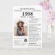 Disez un joyeux anniversaire avec cette carte d'anniversaire de style journal unique, y compris une photo du récipiendaire et une collection de faits amusants et des nouvelles du monde de 1998. Soyez créatif et créez un souvenir personnalisé. Conçu pour ressembler à un journal vintage de style classique noir et blanc. Une façon mignonne et amusante de célébrer les années 90!