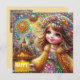 La carte présente une jeune fille heureuse à un feu d'artifice, scintillant avec des pierres précieuses. L'accueil est "Joyeux anniversaire". Le dos a une petite version de l'image avant et beaucoup de place pour écrire un message. AI Bing a aidé à la création de la carte.