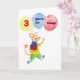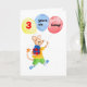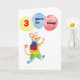 Une carte d'anniversaire pour un enfant de 3 ans avec une souris cheeky peinte à la main, tenant un cadeau et des ballons avec les mots "3 ans aujourd'hui! Le texte intérieur est 'Joyeux anniversaire'