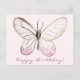 Nouvelle carte Lane - Carte postale simple mais élégante, avec un papillon aquarelle rose et beige, sur un fond rose pâle, et avec un vœu "Joyeux Anniversaire" en typographie élégante.