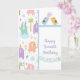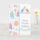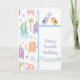 Carte d'anniversaire pour un enfant de sept ans aux jolies couleurs pastel d'éléphants, d'oiseaux et de musique. L'arrière - plan du design est blanc.