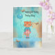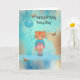 Carte d'anniversaire pour un chaton. L'arrière - plan est mélangé de couleurs turquoises et dorées, le chaton est illustré, tenant un ballon et un cadeau, et se tient sur un bar turquoise. Merci à Creative Fabrica et Hungryjpeg pour certains des éléments du design.