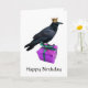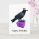 Un corbeau portant une couronne perchée sur un cadeau. Une carte d'anniversaire élégante.