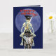 Un squelette motard à cheval sur un porc et fumant une cigarette. A l'intérieur, on voit une photo d'un crâne et d'un verset éffrayant. Une carte d'anniversaire très éffrayante.