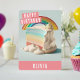 Une carte d'anniversaire mignonne avec l'illustration d'un gâteau à la licorne avec des couleurs arc-en-ciel sur le devant avec "Joyeux anniversaire" en caractères gras blancs, tout casquette. Personnalisez le devant en ajoutant votre ou vos nom(s). L'intérieur de la carte offre de l'espace pour votre message dactylographié ou manuscrit.