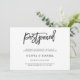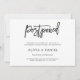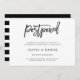 Carte d'annonce de mariage reporté moderne noir et blanc avec un motif rayé au dos. Si la date de votre mariage a dû être modifiée, c'est un excellent moyen de le faire savoir à vos invités.