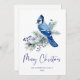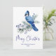 Cette carte de Noël personnalisée sur le thème de l'hiver présente un pot d'aquarelle bleu perché sur des bouges de pin enneigé avec des sprigs de baies bleues.