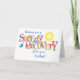 Une carte de voeux lumineuse et joyeuse pour customiser une guérison rapide de toute maladie ou problème de santé. Les grands mots, 'Speedy Recovery' sont remplis de motifs colorés de fruits d'été et de motifs rayés assortis. Il y a un grand soleil, un petit oiseau bleu et une fleur bleue pour créer un look positif. Le message d'accueil de couverture est : 'Wishing you a Speedy Recovery from your ...................', avec la plupart des mots en bleu. Le message intérieur peut également être facilement personnalisé ou supprimé