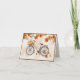 Joli automne inspiré cartes de notes avec un vélo avec un panier tenant un citrouille et le feuillage de chute tout autour sur le devant. L'intérieur est vide et ne contient qu'une très légère image des feuilles d'automne comme arrière - plan pour votre message personnel.