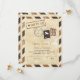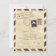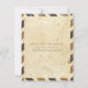 Carte d'avis de sauvegarde inspirée du courrier aérien dans des tons anciens de brun foncé et clair. Timbre factice et marques de poste pour un mariage sur le thème du voyage.