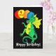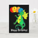 Une carte d'anniversaire colorée pour un enfant de 4 ans avec un dragon vert et jaune, portant des ballons, sur un arrière - plan noir, d'une aquarelle de Judy Adamson. L'accueil sur le devant est 'Joyeux anniversaire' en lettres blanches et l'intérieur est laissé en blanc pour votre propre message.