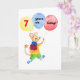Une carte d'anniversaire pour un enfant de 7 ans avec une souris cheeky peinte à la main, tenant un cadeau et des ballons avec les mots "7 ans aujourd'hui! Le texte intérieur est 'Joyeux anniversaire'