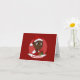 Carte de vœux avec une illustration d'une petite fille ou d'un petit garçon noir souriant et heureux, le bébé porte des vêtements rouges et blancs et tient un cadeau ; avec un modèle de texte modifiable pour votre nom ou message, conception pour les fêtes de Noël avec un fond rouge