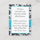 Cette carte de boîtier de réception damassé noir et blanc est dotée d'un ruban imprimé en bleu aqua et d'une broche à bijoux en diamant IMPRIMÉ, ce qui serait parfait pour un mariage à thème aqua et noir. Certains papiers modifieront la couleur de la conception, donc soyez prudent si vous choisissez l'un des types de papier en plus du blanc de base indiqué ici. DE PLUS, si vous redimensionnez la carte, ou si vous changez de polices, ou la taille de la police, une partie de la conception et/ou du texte peut être coupée. Tout va s'imprimer comme vous le voyez sur votre écran. Je ne verrai pas votre carte, et Zazzle ne corrigera rien (fautes de frappe, mauvais alignement, etc.). Le texte et le papier sont tous personnalisables. Si vous avez besoin d'aide avec cette carte, envoyez-moi un courriel AVANT de passer votre commande. Si vous avez besoin d'autres articles correspondants, veuillez envoyer votre demande par courriel à niteowlstudio@gmail.com