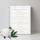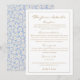 Chic et frais avec charme jeune. Cette carte Finer Detail présente un ensemble de polices dorées tendance et modernes, contre un arrière - plan blanc immaculé. Le dos de la carte est orné d'une veste bleu fleurie et ludique. Vous trouverez les détails de la réception, de l'hébergement, du transport, de la tenue et du site Internet mariage. Personnalisez pour en faire votre propre.