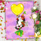 Un chat calico mignon, qui porte un chapeau de fête et tient un bouquet de fleurs blanches dans une patte, et tient un cadeau avec sa queue, est soulevé dans les airs par un grand ballon en forme de cœur jaune. Le fond est rose et violet comme un ciel du soir.