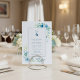 Cette carte de numéro de table élégante dispose d'une bordure florale de style aquarelle bleu doux et d'une liste de noms propre facile à lire dans une police serif pour un look mariage romantique raffiné. Inclut l'espace pour les listes de noms d'invités sous le numéro de table, ce qui en fait parfait pour votre tableau de sièges ou l'affichage de la table de réception. Associez les menus correspondants et placez les cartes dans la même palette pour créer un paysage de table cohésif dans toute la réception.