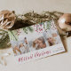 Le carte photo de fête de vacances comporte le rouge et les baies d'aquarelle peintes par vert, feuille et branches, jetant un coup d'oeil à partir du dessus de la carte. Ajoutez trois de vos photos carrées préférées alignées côte à côte. Le "plus Joyeux Noël" apparaît au fond dans la typographie de manuscrit marquée avec des lettres par main rouge. Personnalisez avec votre salutation et noms faits sur commande sur la droite inférieure.
