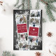 Cute holiday Phocard features two photo booth strips, each with three acceptée and cranberry red text panel, for a total of six copies. Personalize with the year and your familiy name or nam in whimsical, festive white lettering, on a rustic chalkboard background dotted with hand drawn white snowflakes.