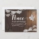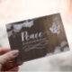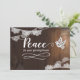 Exprimez vos condoléances à quelqu'un avec cette carte élégante, présentant le message "Paix pour vos cœurs endeuillés". Le design apparaît sur fond de bois avec une colombe artisanale et des accents de corde en dentelle sur les bordures supérieure et inférieure (qui peuvent être supprimés). L'intérieur peut être personnalisé mais comporte ce message, "Je pense à vous en ce moment de tristesse et vous envoie, ainsi qu'à votre famille, mes prières et mes sincères condoléances."