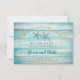 La carte de conservation moderne présente un fond en bois rustique de couleur turquoise. Deux étoiles de mer ajoutent une touche de plage et représentent le couple fiancé. La couleur corail de la police ajoute un contraste frais. Cette carte est idéale pour un mariage à destination, un mariage sur la plage ou un mariage au bord de l'océan. L'effet rustique est parfait pour un événement à thème de plage cosy.