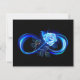 Luminous infinity symbol with glowing, beautiful, lushly blooming rose made of blue flames on black background.