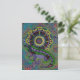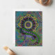 Un lézard vert et violet dressé contre un mandala burgandy, turquoise, violet et vert.