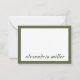 Le design de la carte à billet plat à double face intemporelle présente un design monogramme vert olive et blanc avec nom dans le script moderne dans les tiers inférieurs, encadré en olive. Carte de note élégante qui peut être personnalisée avec votre nom ou texte personnalisé. L'espace pour votre note manuscrite est inclus à l'avant et à l'arrière.