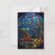 Conception en verre tendu avec une arche en violet, bleu, vert et violet. Fleurs jaunes, rouges et violettes. Un oiseau gris sur une branche, l'autre est marron, bleu et blanc.