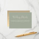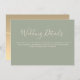 Carte de détails de mariage vert sauge moderne et minimaliste avec un cœur de corde dorée au dos et une écriture calligraphique simple.