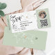 Destination Billet de carte d'embarquement pour mariage à la plage avec avion en or Sauvegarder la date avec icône de cœur et d'avion avec carte du monde d'art en ligne minimaliste simple et couleur de fond vert sauge. Ajoutez votre code QR