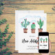 Cette carte de faire-part mobile est décorée avec des cactus aquarelle, un ciel bleu, et New Address dans la typographie stylisée. Facilement personnalisable avec votre nouvelle adresse. Utilisez l'outil de conception pour modifier la taille, le style ou la couleur du texte. En créant notre oeuvre, vous ne trouverez pas cette image exacte d'autres créateurs. Aquarelle originale © Michele Davies.