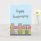 Cartes fantaisistes "joyeux anniversaire de maison" pour le marketing de l'immobilier. Le design présente un quartier urbain mignon sur un fond bleu clair. Parfait pour les agents immobiliers résidentiels, les prêteurs hypothécaires, les agences de titres, les services d'inspection de maison, etc.