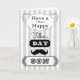 Voici une carte contemporaine de fête des pères d'amusement pour votre fils. Elle comporte des rayures grises et blanches et une moustache. Cartes de ©2014 Kreative Sentients par le xérès Harris