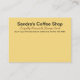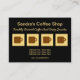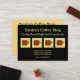 Cartes de visite personnalisables de café-restaurant. Ajoutez vos propres détails en quelques minutes. Images des tasses de café. L'arrière - plan est noir. Vous pouvez changer la couleur de l'arrière - plan comme vous souhaitez aussi bien que le style de la police. De retour de ce café-restaurant le carte de visite peut être employé pendant qu'une fidélité récompense la carte, sur laquelle votre personnel peut mettre l'endroit un timbre. Si ceci n'est pas exigé, ceci peut être simplement supprimé de la carte.