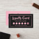 Ces élégantes cartes perforées modernes rose et noir pour la fidélité de la clientèle sont une façon de ramener vos clients pour plus, en les remerciant pour leur entreprise répétée avec une récompense. Ces cartes de fidélité ont le nom de votre entreprise sur un côté, avec 6 cercles pour poinçonner pour chaque service ou achat. Le sixième a un coeur et donne droit à votre client ou client à votre offre spéciale, que vous pouvez customiser sur la carte, qu'il s'agisse d'un rabais ou d'un freebie. Le côté opposé a une place pour votre logo personnalisé, et vos informations commerciales : votre nom, titre, adresse, téléphone, informations sur les médias sociaux, et site Web (que vous pouvez remplacer par votre adresse si vous le souhaitez. Une belle façon de montrer votre appréciation, que vous soyez un salon de beauté, un salon de ongles, un brow artiste, coiffeur ou un prestataire de services indépendant.