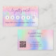 Un arrière - plan holographique branché aux couleurs unicorne et aux couleurs arc-en-ciel rose, violet, vert menthe. Décoré avec des gouttes. Sur le devant : Ajoutez-vous la remise. Retour : Personnalisez et ajoutez votre nom, titre, numéro de téléphone, courrier, adresse du site, code qr à votre site Web. Lettres violettes. Sans gouttes sur le dos.