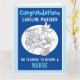 Félicitations à une infirmière qui a terminé sa formation en soins infirmiers. Illustration amusante d'une infirmière lisant un journal avec un concours de point à ébullition. Carte de félicitations pour une infirmière nouvellement qualifiée.