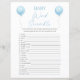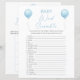 Cette carte de jeu à double face est dotée d'un jeu de mots sur l'avant et d'un bingo sur l'arrière, et est parfaite pour un baby shower ou un bébé saupoudré. Ce jeu de bingo avec un mot de scramble est doté d'un ballon bleu aquarelle. Vous pouvez personnaliser cette conception en cliquant sur "Personnaliser ce modèle" ou si vous souhaitez modifier la police, les couleurs ou organiser les éléments de conception d'une manière différente, vous pouvez cliquer sur "Modifier à l'aide de l'outil de conception". Clé de réponse : 1. Déchets 2. Bassinet 3. Bouteille 4. Crib 5. Pacifique 6. Modification du tableau 7. Animal farci 8. Poussette 9. Caoutchouc 10. Couverture 11. Ensemble 12. Formule 13. Haut président 14. Mobile 15. Thermomètre 16. Bébé 17. Lait 18. Booties 19. 20. Ours en peluche