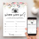La carte de jeu de Baby Shower "Blush Floral Where Were We" offre un plaisir personnalisable avec son design floral mettant en vedette des roses roses pastel. Parfait pour les douches de mariage, les invités peuvent se remémorer et deviner où divers événements se sont produits, ajoutant un élément interactif à la célébration.
