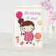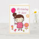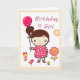 Carte de joyeux anniversaire avec la "fille d'anniversaire" écrite dans le rose, une petite fille, cinq fleurs et un oiseau.