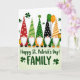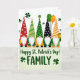 Sur le devant de la carte, cinq gnomes mignons se tiennent épaule contre épaule en ligne droite, leurs barbes blanches et duveteuses et leurs nez ronds leur donnant un air confortable et amical 💚. Chacun porte un haut chapeau conique avec un motif différent, notamment des pois rouges, des rayures vertes, des chevrons orange et blanc et un chapeau noir parsemé de blanc. Leur proximité et leurs poses légèrement inclinées les font ressembler à une petite photo de groupe, comme s'ils se penchaient pour partager un rire. De petits trèfles flottent autour d'eux, et deux ballons - un vert foncé et un orange vif - flottent à proximité pour une touche de fête ☘️. Un gnome tient un petit pot d'or tandis qu'un autre porte un petit seau doré, ajoutant un doux moment "nous avons apporté les friandises" entre amis. Sous les gnomes, le message « Joyeuse Saint-Patrick ! FAMILLE » est centré en lettres vertes, facile à rep