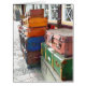 Un design simple aquarelle d'une gare en temps de guerre. Des valises empilées sur la plate-forme en attendant que le train à vapeur les transporte vers leur destination. Angleterre.