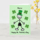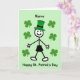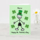 Belle caricature d'un garçon qui sourit. La carte est décorée d'un arrière - plan vert pâle et de shamrocks pour une joyeuse Saint Patrick ! Le garçon porte un casquette irlandais. Personnalisez facilement cette carte en modifiant le texte modèle à l'avant et à l'intérieur. Merci d'avoir vu mes dessins !