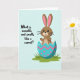 Cette carte montre un personnage ressemblant à un lapin aux longues oreilles qui regarde en sortant d'une fissure dans un œuf, faisant un petit salut de la patte qui ressemble à un amical bonjour 🐰. La créature est ombrée de brun chaud avec des oreilles intérieures roses, des yeux ronds noirs brillants et des fines moustaches qui adoucissent son visage. La coquille de l'œuf est turquoise avec des lignes ondulées roses et des points éparpillés, posée sur une petite touffe d'herbe verte qui suggère un moment printanier en plein air 🌷. Derrière tout cela, un fond bleu ciel pâle et lisse maintient l'attention sur le personnage et sa pose douce et accueillante. Sur le côté gauche, une énigme est imprimée en lettres arrondies et courbes : « Qu'est-ce qui est invisible et sent la carotte ? ». Le texte est en encre foncée pour un contraste fort avec le fond clair, espacé pour équilibrer le lapin sur la droite. Les formes simples et les zones de couleur unie donnent à la scène un aspect net et moderne, tandis que l'expression douce du lapin ajoute une touche